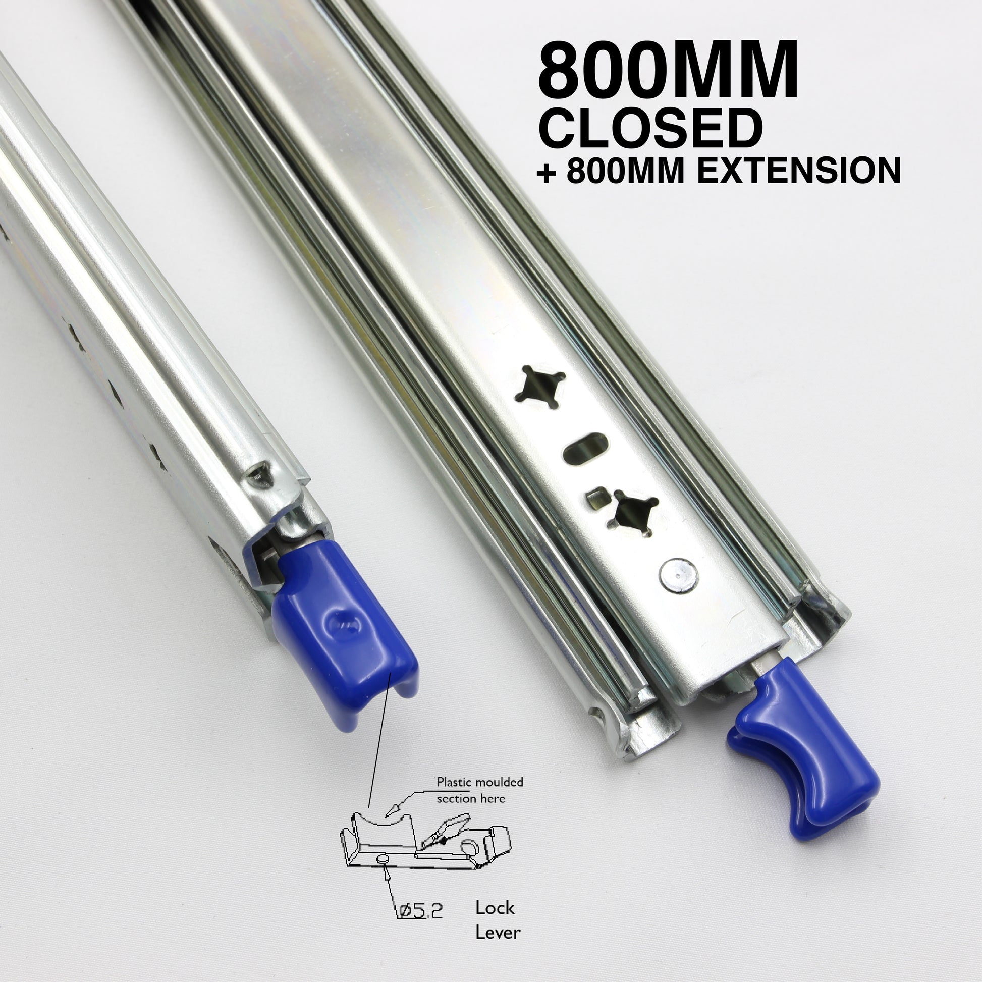 1 Pair | 800mm | 125kg Locking Drawer Slides | Full Extension Runners | Medium Duty