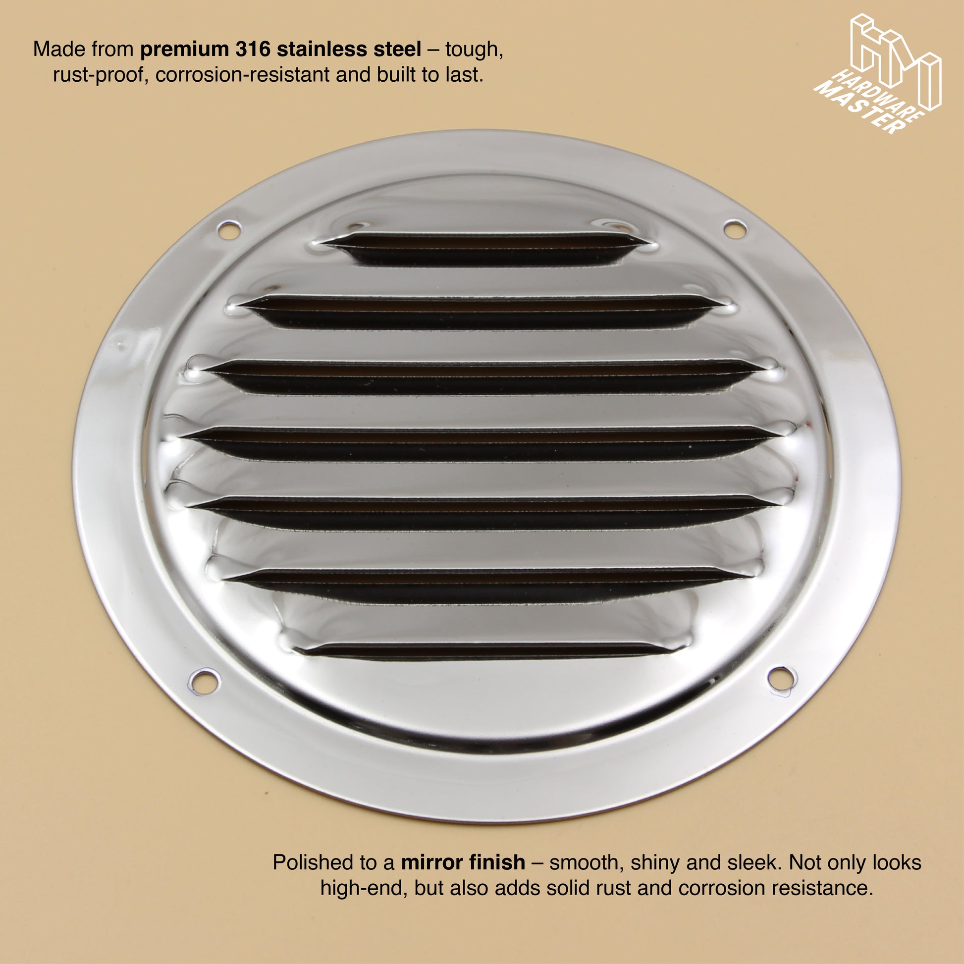This 125mm Stainless Steel Round Vent is built tough for marine and outdoor use. Made from Marine Grade S316 stainless steel, it’s corrosion-resistant, durable, and ideal for boats, caravans, 4x4s, campers, trailers, and sheds. The polished mirror finish adds a sleek professional look while providing extra protection against rust and salt.